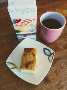 So oder so ähnlich sah oft genug mein Mittagessen aus. Caaaaaffffeee ! ^^  Ich hatte mir zum ausprobieren einen der kleinen neuen Küchlein von Schnitzer mitgenommen. Leider war bis auf Zitronenkuchen alles vergriffen. Hätte gerne noch Straciatella und den Schokomuffin probiert. Nächstes Mal.  Von dem Zitronenkuchen war ich sehr angenehm überrascht. Hatte jetzt den direkten Vergleich zu dem Zitronenschockkuchen von “Lovemore”  der mir ja eindeutig zu süß und zu künstlich war. Aber trotzdem irgendwie lecker (warum auch immer ^^)