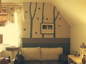 Aber wenigstens ist das Wohnzimmer jetzt einigermaßen. Eine Wand fehlt noch,aber dazu brauch ich halt den neuen Farbpott ^^ Da kommt dann ausser der Borte auch nichts dran. Das wäre sonst zuviel glaub ich,wenn an allen drei Seiten die Bäume wären. Zumal die gegenüberliegende Wand mit Holzpanelen ist.