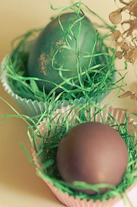 und der kleine Osterkuchen wartet jetzt gerad noch auf die Herstellung. Magarine vergessen aus´m TKfach zu nehmen ^^ Natürlich liegen noch mehr bunte Eier in der Küche,aber die waren zur Zeit des Fotos noch im Färbebad 😉 Ganz simpel und einfach mit Lebensmittelfarben,die dann doch eine etwas weitere Farbpalette erlauben als die Osterfarben. Wobei das bei braunen Eiern ja auch immer so eine Sache ist. Da kann man gelb und elfenbein auch mal ganz fix vergessen. Und schwarz … ach näää,soweit geht die Gruftnase dann doch nicht. So fiel die Wahl auf blau,grün und lila …. bei rosa hätte ich wohl einen auf´s Dach bekommen *gg*