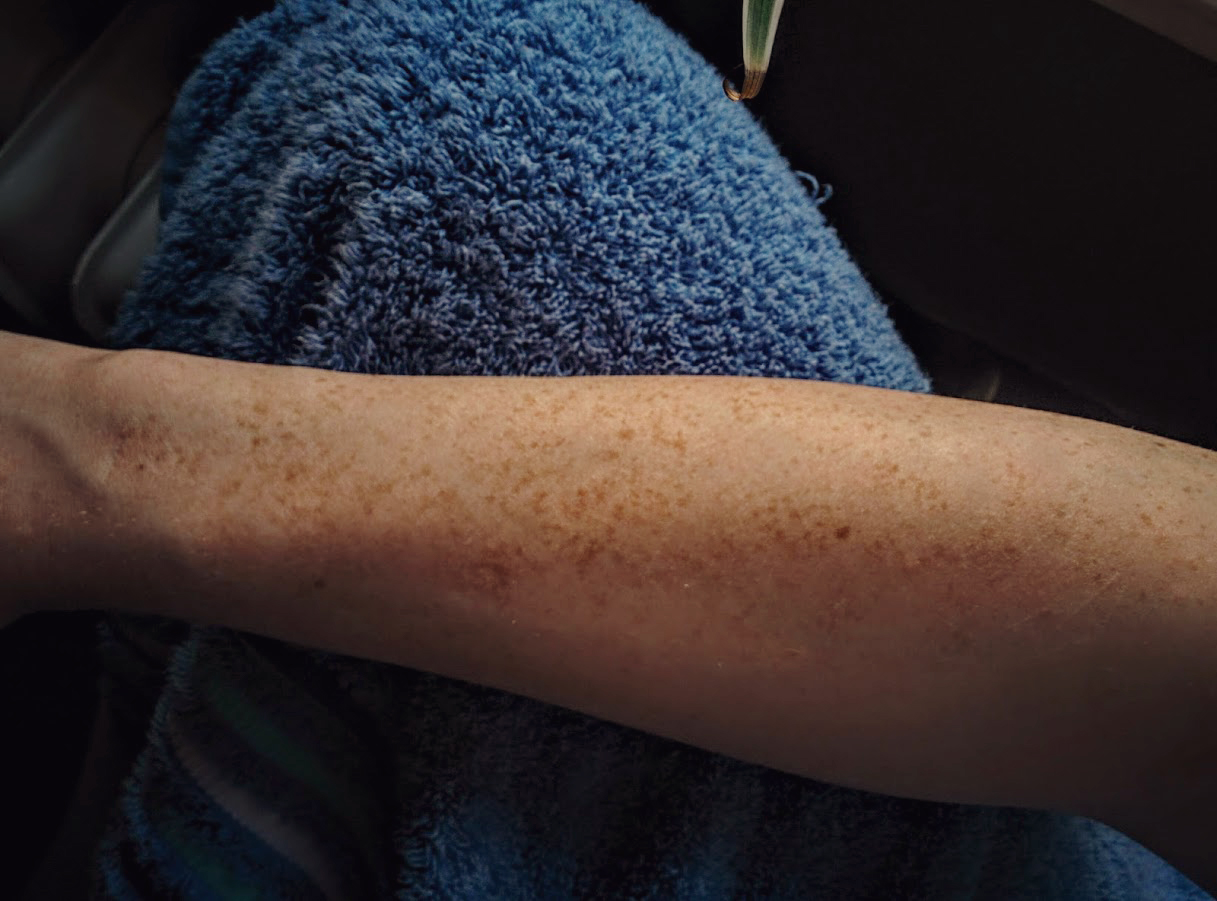 Sommersprossen sprießen wie nix ^^ Aus Jux mal nen Bildchen von meinem Arm gemacht. Schäbig nach´m duschen. Einigermaßen sieht man sie sogar. Etwas braun bin ich zudem auch noch geworden Oo Dachte ich spinne. Normal tut meine Haut das nämlich nicht. Im Gesicht brauchen die Sprossen noch eine Runde. Da ich inzwischen nicht mehr ganz so schwarze Augen habe und nicht unter 3 Schichten Makeup verschwinden muss,etwas Aufheller reicht,bin ich dazu übergegangen das Makeup weg zu lassen und die Sprossen sprießen zu lassen. So ganz begriffen haben sie´s noch nicht … aber sie kommen langsam wieder 😉 Ansich hat man früher nämlich kaum noch Haut gesehen … nur noch Freckles ^^ Wieder so ein Punkt wo ich merke,das sich der Körper langsam aber sicher vom Glutenschock erholt. Wobei die Augenringe echt schon extrem waren -.- Hatte mich ansich schon damit abgefunden das sie nicht zurückgehen und ich ewig damit rumlaufen bzw. stärker schminken muss. Umso mehr hupfe ich jetzt natürlich das sie doch wieder verschwinden \o.o/