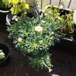 Besagte Discounter-Magarite ♥ der kleine Ahorn (ich hoffe der wird noch orange ^^) und im Hintergrund das Möhrengrün und eine Mini-Dahlie ~ die Palette mit den angeschlagenen Pflanzen.